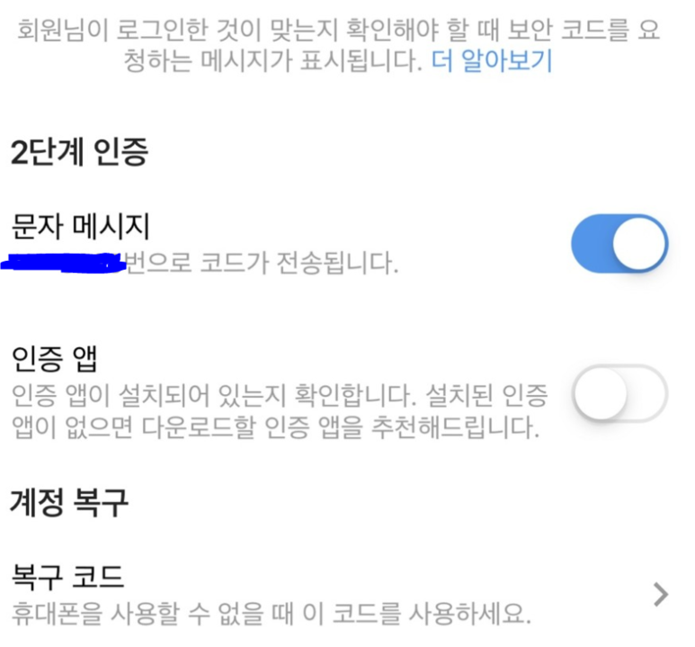2단계 인증을 하게 되면 다른 사람이 인증되지 않은 기기를 통해서 로그인 하려면 특별한 로그인 코드를 입력하도록 뜨게되는 기능입니다.
