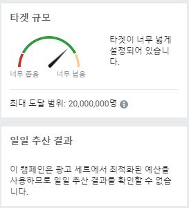 타겟을 설정하고 오른쪽을 보니까 타겟이 너무 넓게 설정되어 있다고 한다..... 연령대를 좁힐까? 관심사를 더 넣을까?